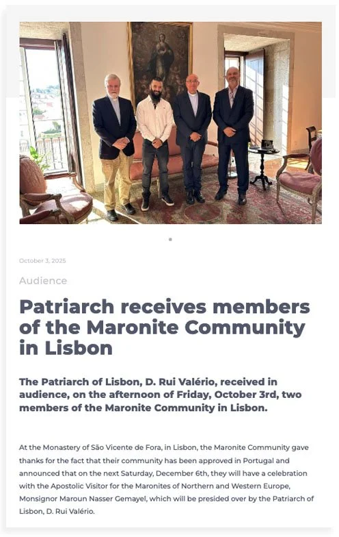 PressReleases Become a Member Become a Member Featured in Press Releases Association created in Portugal for Lebanese Maronites Patriarch meets with Maronite Bishop upon arrival of the relic of Saint Charbel. Patriarch receives members of the Maronite Community in Lisbon The Lebanese community in Portugal receives relics of Saint Charbel and launches the "Saint Charbel - With Us" association to promote spiritual and community life. Bishop Gemayel to the Lebanese community in Portugal: Your church will not forget you and will not abandon serving you. Bishop Gemayel concluded his visit to Portugal: affirming the Maronite Church's continued presence in new areas. Bishop Gemayel visits Portugal, celebrates Sunday Mass in Lisbon, and meets with the community with the aim of strengthening its connection to the homeland.